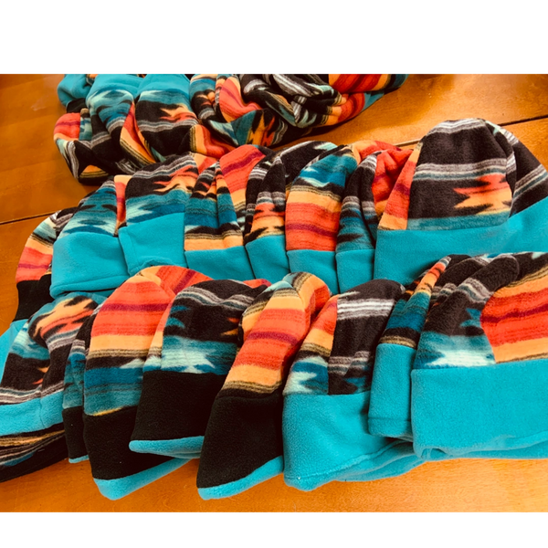 We sewed reversible blizzard fleece beanies and shopped for toiletries, snuggly socks, and warm mittens. The items, along with holiday cards, were packed into LOVEMARIN drawstring backpacks.